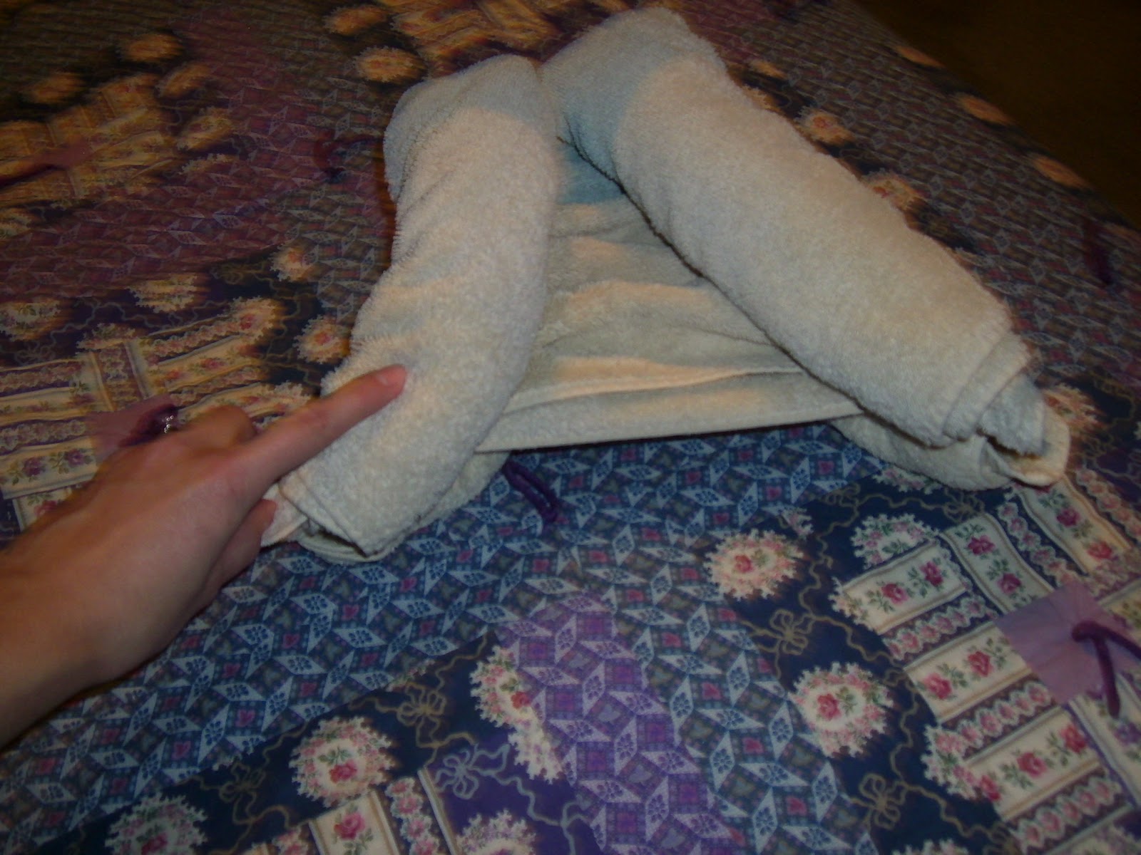 | Now here comes the hard stuff: grab the corners of the towels in both hands and pull the 2 left rolls and the 2 right rolls apart |